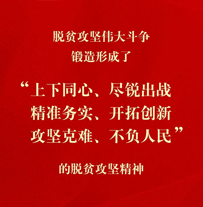 “全黨全國(guó)全社會(huì)都要大力弘揚(yáng)脫貧攻堅(jiān)精神,團(tuán)結(jié)一心,英勇奮斗,堅(jiān)決戰(zhàn)勝前進(jìn)道路上的一切困難和風(fēng)險(xiǎn),不斷奪取堅(jiān)持和發(fā)展中國(guó)特色社會(huì)主義新的更大的勝利!”